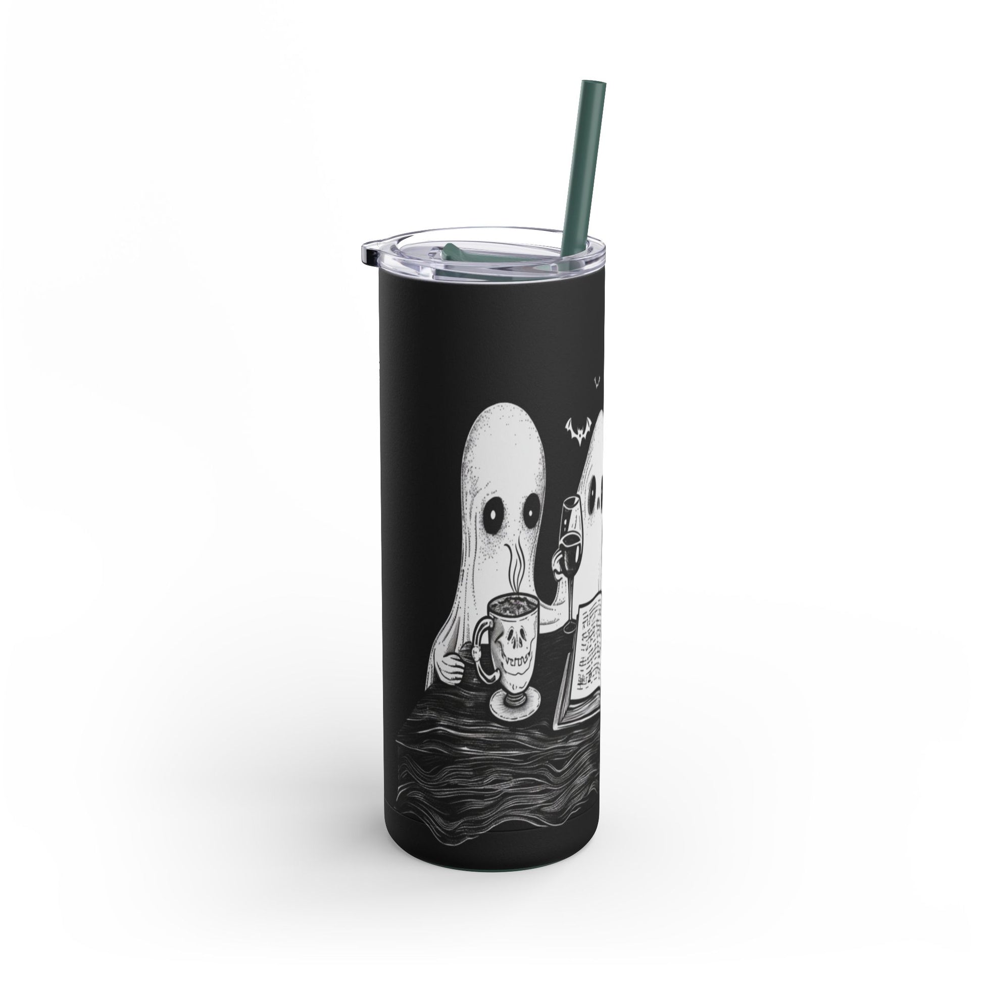 Introducing the perfect companion for your on-the-go lifestyle: the stylish Skinny Matte Tumbler. Whether you're enjoying a warm coffee on a chilly morning or sipping iced tea during a summer picnic, this tumbler keeps your drinks at the ideal temperature. Four ghostly pals, one enchanted story and a table full of pumpkin spice and wine.Perfect for busy students, working professionals, or anyone who loves to express their unique witchy, Halloween lover style, this tumbler makes a fantastic gift for birthdays, Halloween celebrations, or holiday gatherings. Add a dash of personality to your hydration game with this must-have accessory!