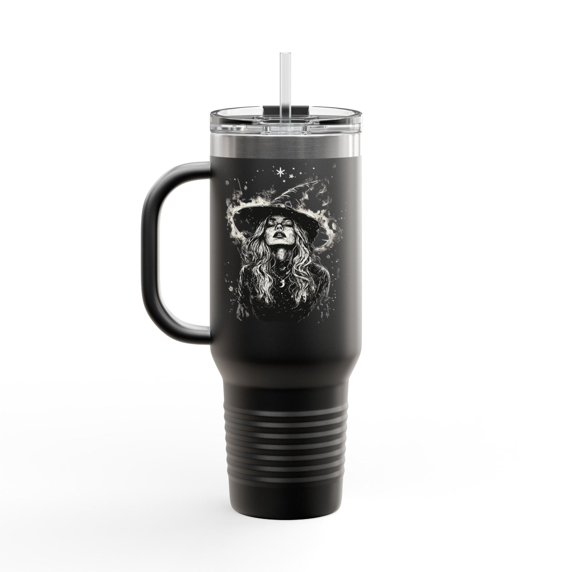 Stay hydrated and stylish on your witchy wanders with this Insulated Travel Mug, featuring the Moonlit Witch design, a symbol of the feminine power. her wisdom and nocturnal magickal workings. Cloacked in moonlight and stardust, her powerful gaze pierces the veil, embodying protection, intuition and enchantment.
