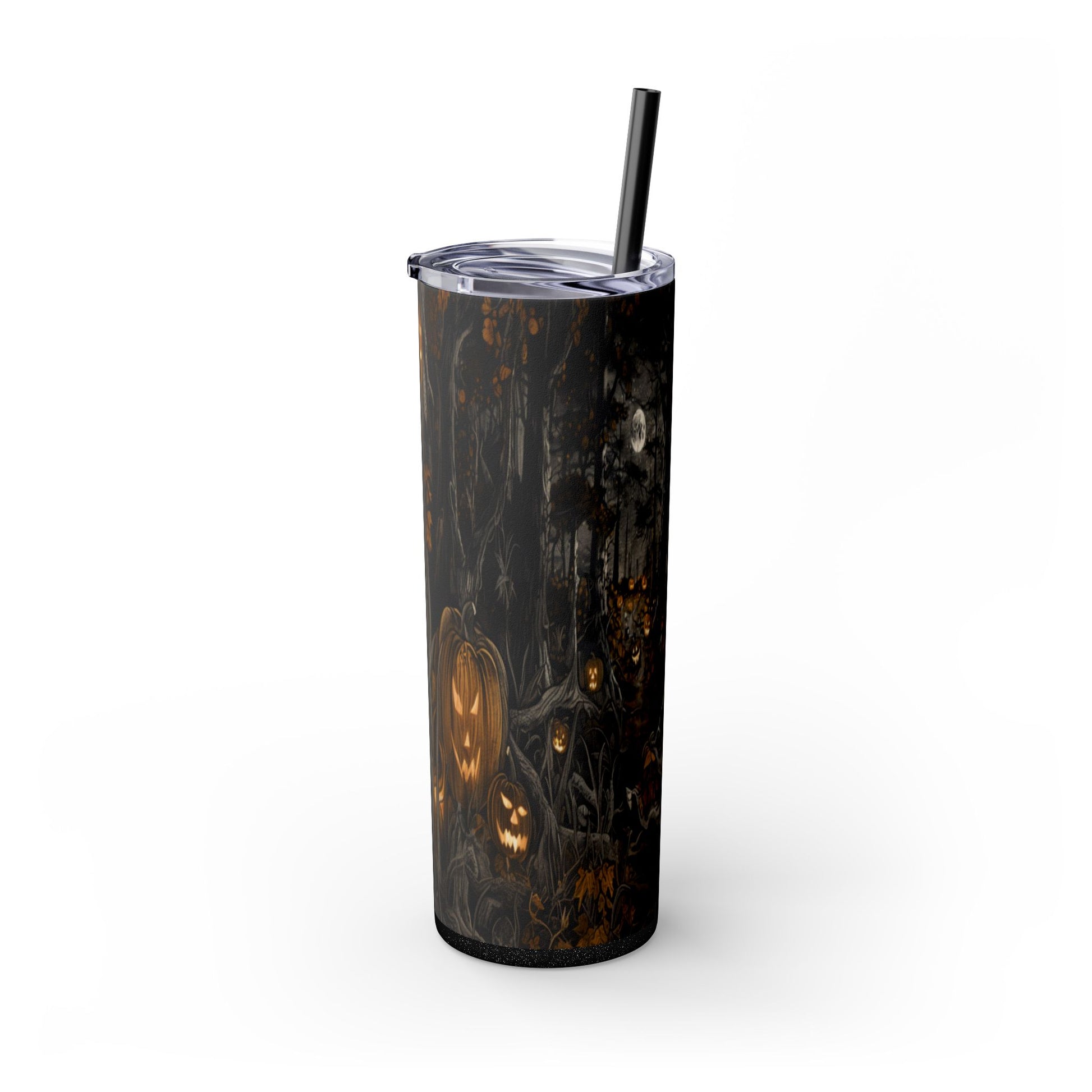 Step quietly and you'll hear them...the whispers that echo through the darkened forest, winding around ancient trees and flickering jack-o'-lanterns. The Whispers in the Woods tumbler captures the haunting beauty of the witching season in full glow. This haunting artwork of ghostly figures, glowing pumpkins, twisted roots and a mysterious witch nestled in the shadows brings a spark of October magic, like a spell woven in ink... Will she trick or treat?